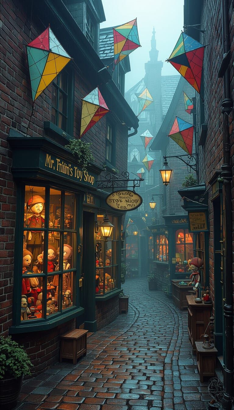 A captivating view of a whimsical toy shop at the end of a foggy alley. The image evokes a dark fantasy storybook, displaying vibrant colors and intricate textures in a Tim Burton-esque style.