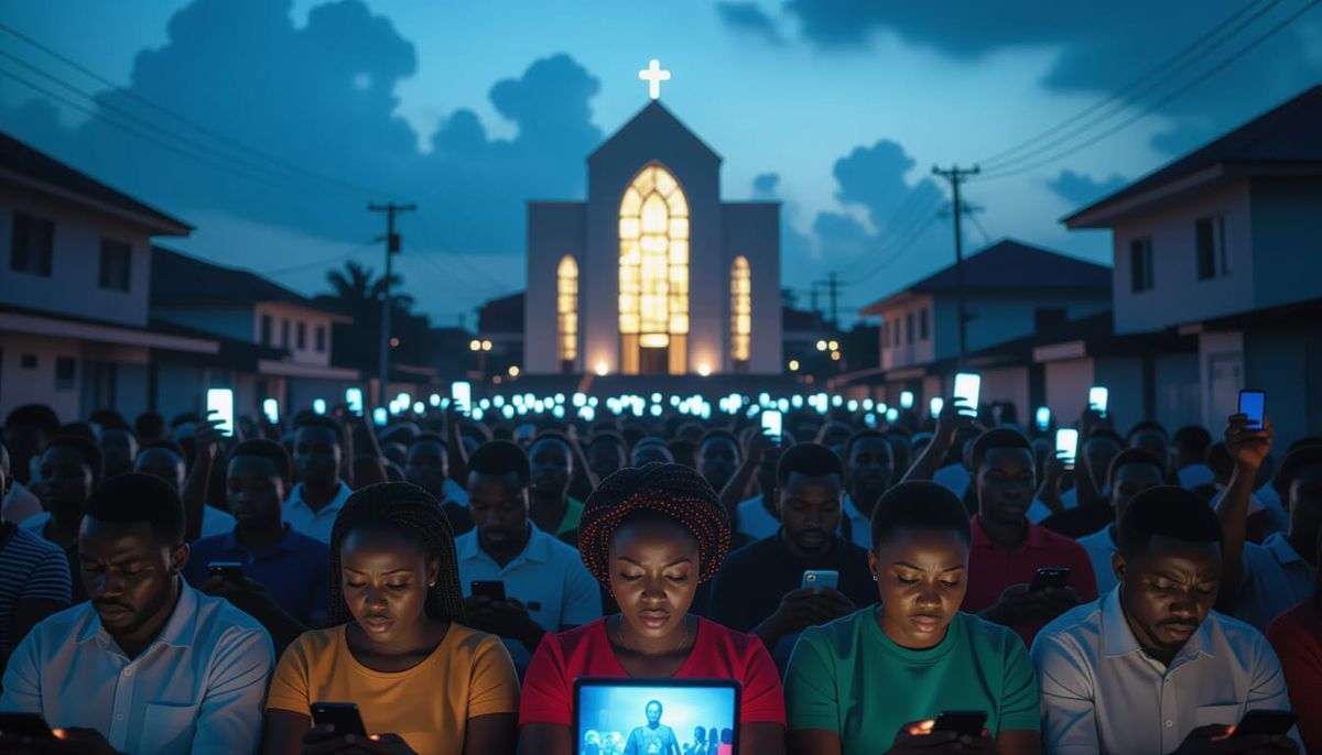 This photorealistic image captures a tense night scene in a Nigerian city, where people react with fear and confusion to a viral video on their devices. Moody lighting and dramatic shadows enhance the unsettling atmosphere.