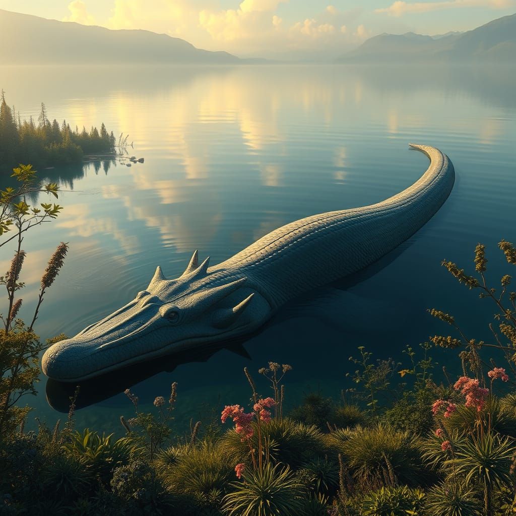 A surreal image of a plesiosaur swimming in a lake. The artwork blends realistic and mystical elements with warm lighting and atmospheric water effects, reminiscent of Beksiński's dark surrealism.