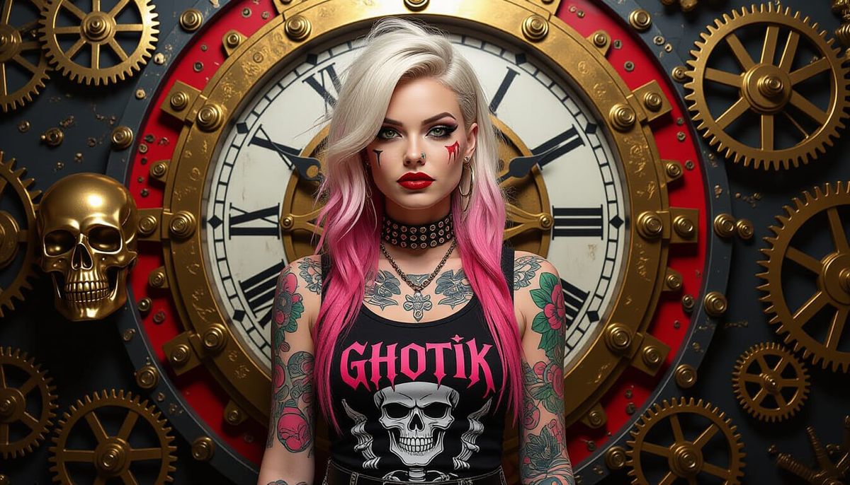 This image shows a punk rock girl with tattoos and colorful hair. She stands before a metallic clockwork backdrop in shades of red, gold, and black, rendered with high contrast and cinematic lighting.