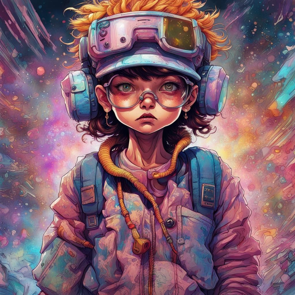 This image depicts a humanized character reminiscent of Dr. Slump in a holographic style. The mixed media illustration features vibrant colors in a psychedelic aesthetic.