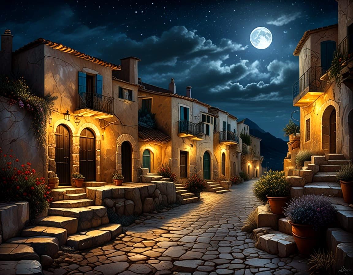 A breathtaking acrylic painting of a quaint Mediterranean street illuminated by moonlight, with a starry sky and distressed texture, showcasing rich detail and dynamic light in a dramatic, wide-angle scene.