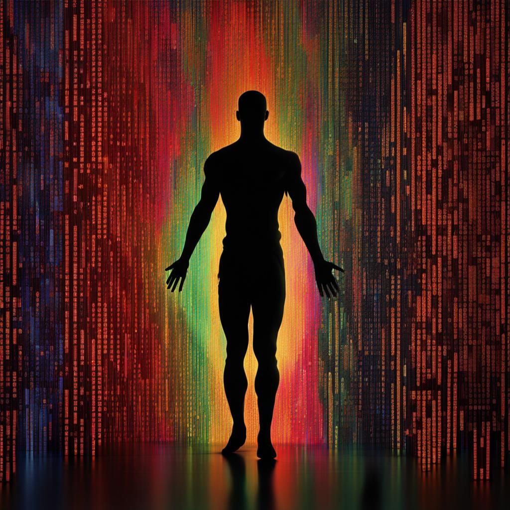 This image shows a muscular man's silhouette formed by colorful binary code. The digital dance of lines and patterns creates a fusion of technology and art in a vibrant, highly-detailed digital painting.