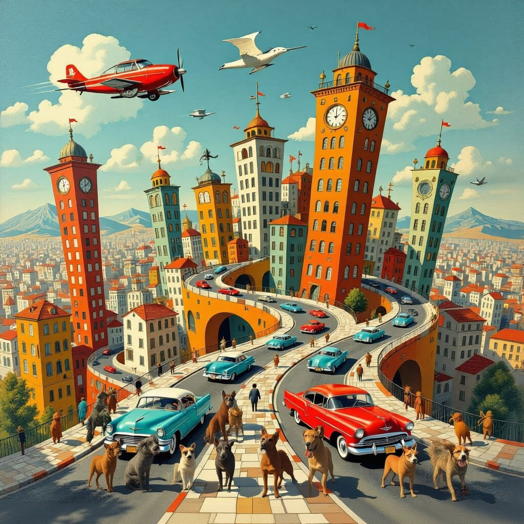 This image shows a surreal city with flying cars and animals fleeing in panic. The chaotic scene is filled with vibrant colors and fantastical elements, creating a dreamlike atmosphere.