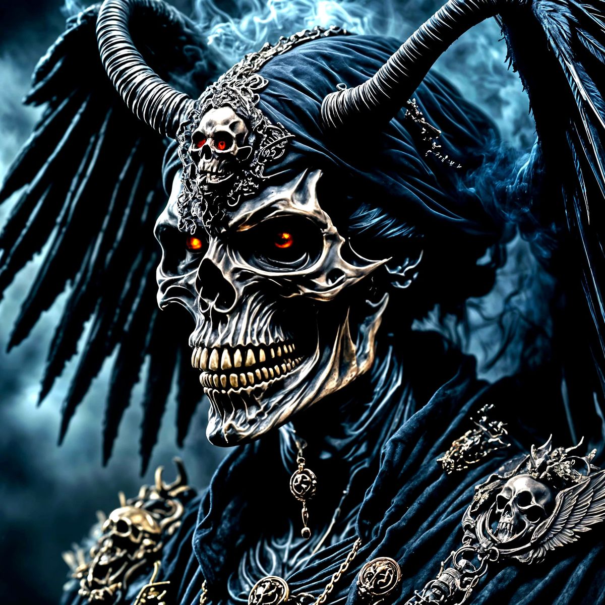 A striking picture of a winged demon formed from smoke. The hyperrealistic digital art features a highly detailed demonic skull.