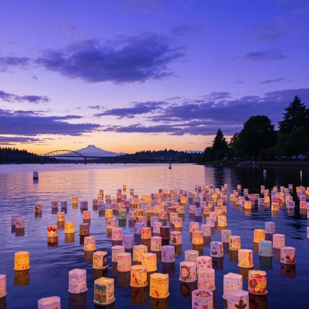 Hundreds of floating paper lanterns adorned with vibrant drawings, prayers, and writings, drift peacefully on a calm body of water in Portland Oregon