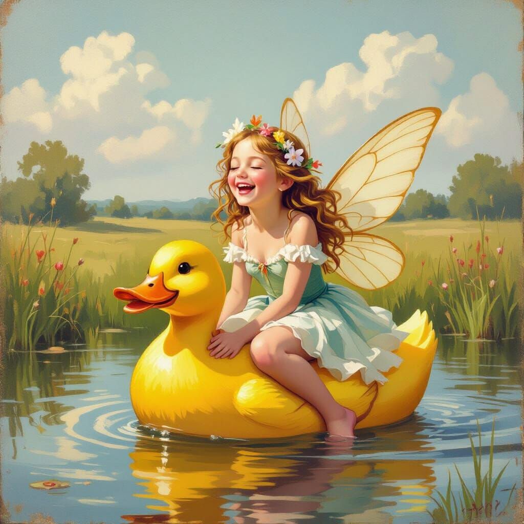This image shows a fairy laughing and riding a yellow duck amidst a serene waterside meadow. The artwork is reminiscent of warm oil paintings with soft, whimsical brushstrokes.