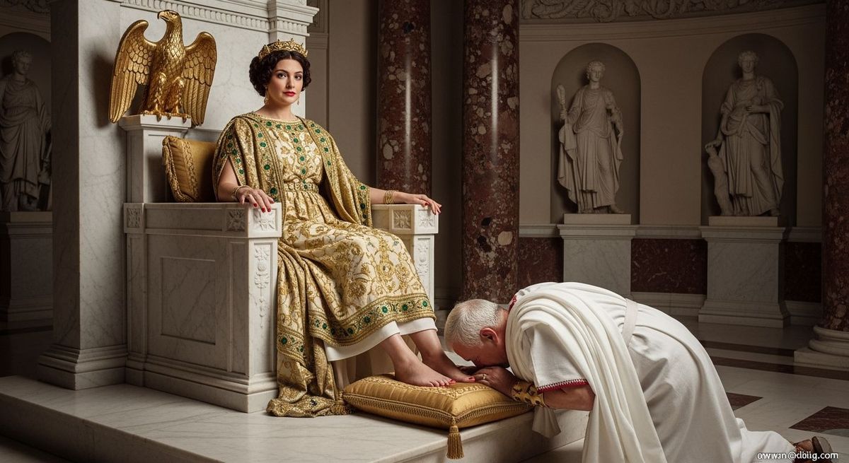 This image depicts Empress Messalina on a marble throne in an opulent throne room. A Roman senator is bowing before her, captured in high-definition with natural lighting, reminiscent of classical photography.