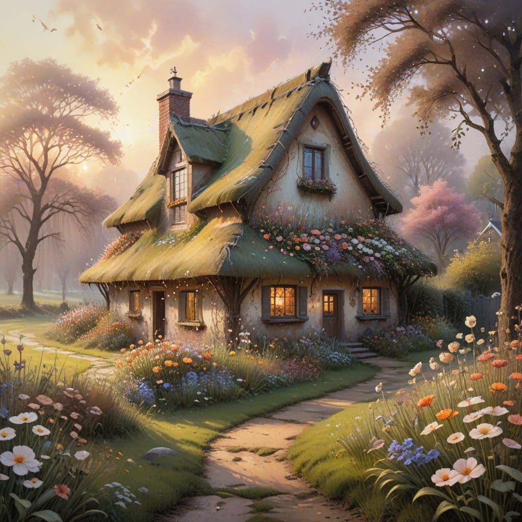 This enchanting image depicts a charming North Frisian cottage nestled on the dike, surrounded by a breathtaking spring garden in full bloom. Soft, ethereal lighting and muted earthy tones evoke a sense of warmth and serenity, while vibrant florals and intricate details add a touch of whimsy and wonder.