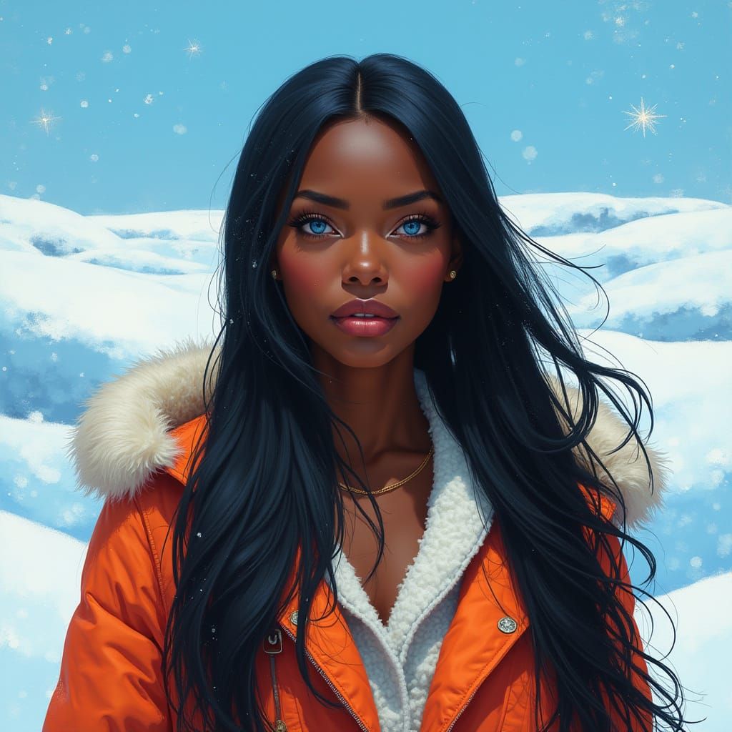 A striking picture of an African woman in winter clothing, set against a snowy landscape under a blue sky. With long dark hair and piercing blue eyes, the image is reminiscent of vibrant digital art.