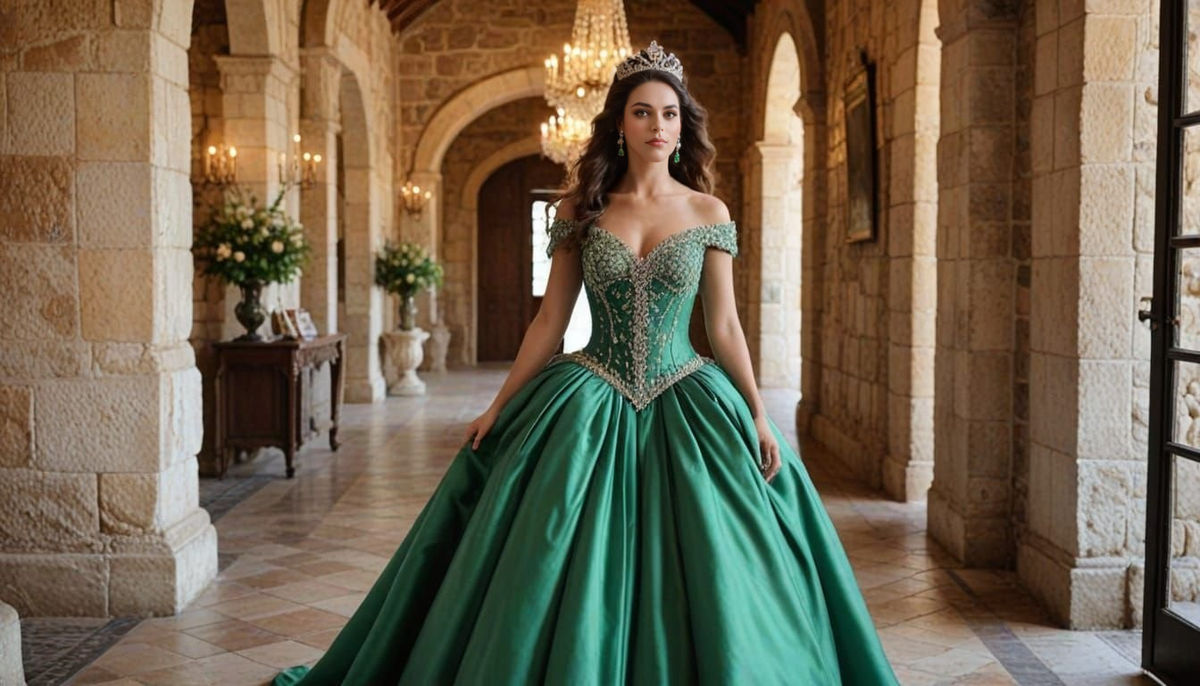"“Princesa branca muito linda, cabelos pretos esvoaçantes, vista de corpo inteiro, em pé no salão de um castelo luxuoso. Aparência totalmente realista. Vestido verde de princesa, volumoso e elegante, joias brilhantes e coroa dourada detalhada. Luz suave entrando pelas janelas, atmosfera real, sofisticada, clássica e mágica, estilo fotografia real.”"