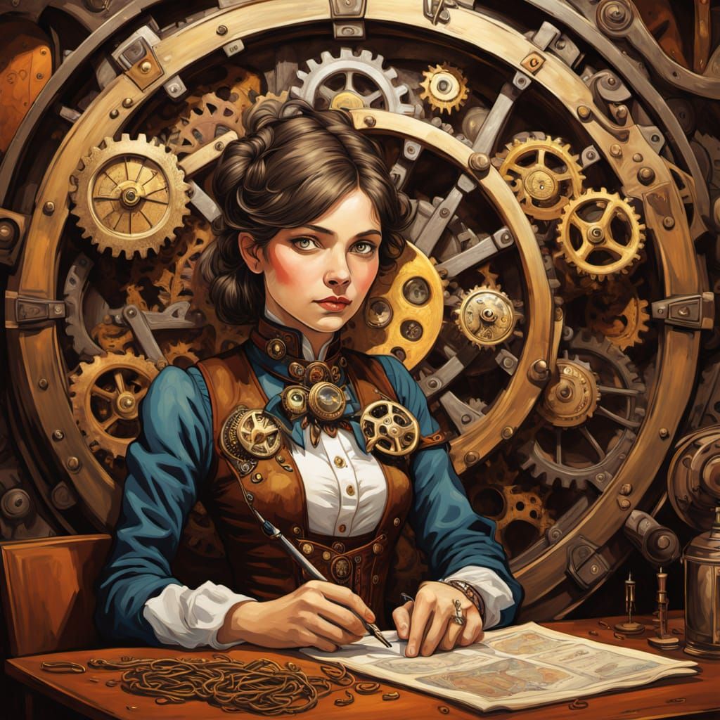 This image shows a woman sitting at a table in a steampunk restaurant. Clockwork mechanisms and gears decorate the walls in an Art Nouveau style. The artwork is rendered as a detailed oil painting with warm, golden lighting.