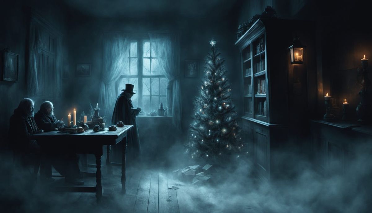This illustration shows spectral figures of Christmas past, present, and future haunting Scrooge. Moody, atmospheric lighting with deep shadows creates a chilling, narrative art scene.