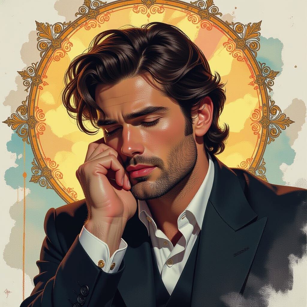 A charcoal drawing of a man consumed by love, rendered with ethereal fantasy elements. The artwork features dynamic lighting, thick brushstrokes, and vibrant triadic colors, reminiscent of art nouveau.