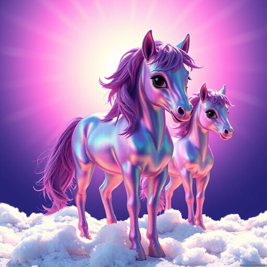 This image showcases intricately detailed ponies with shimmering iridescent coats, set against a soft, cloud-like terrain with subtle texture and shading, evoking a sense of magic and wonder in a cinematic style reminiscent of Industrial Light and Magic.