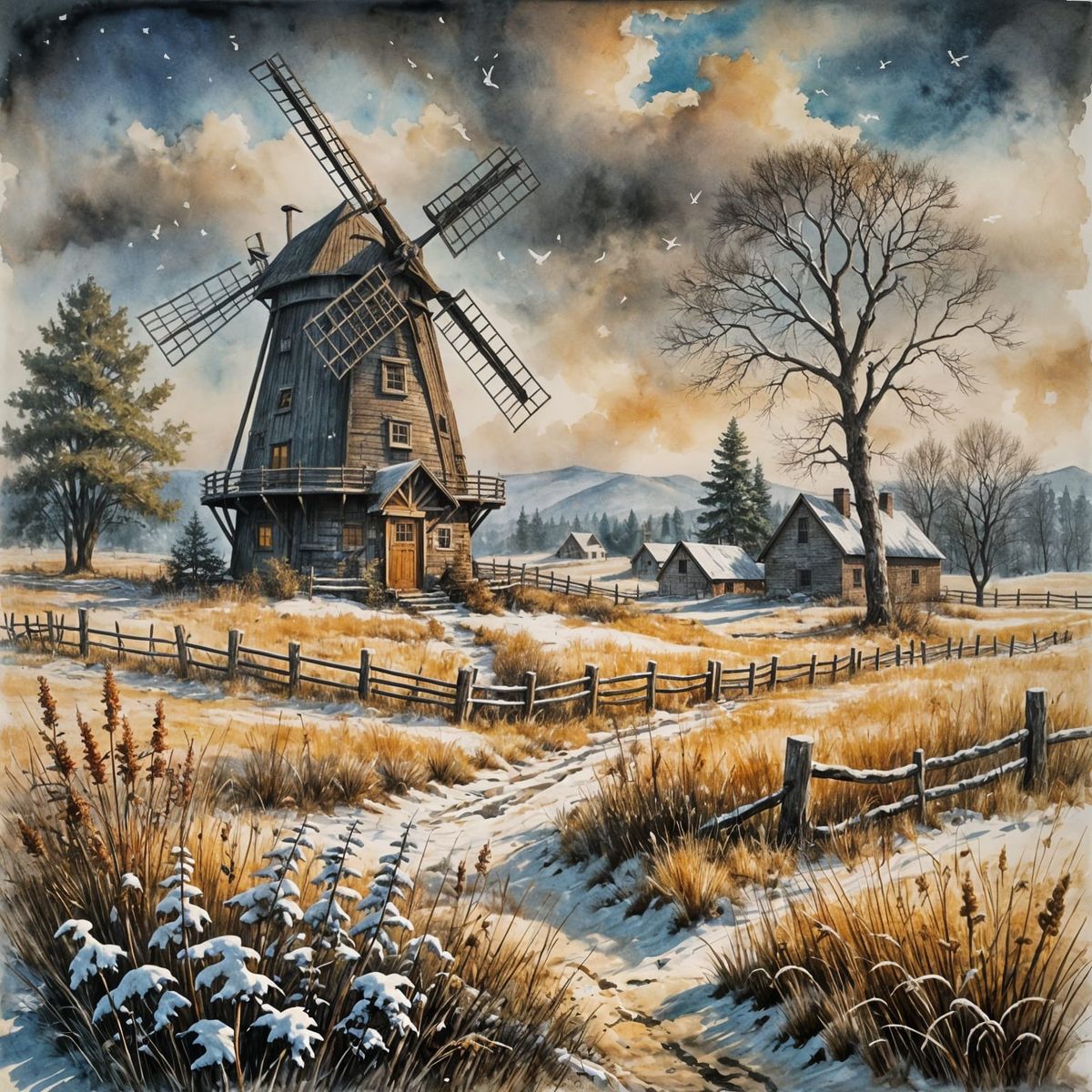 a rustic scene featuring an old windmill standing tall in a Winter picturesque meadow,include a Snowman Include a quaint miller's cottage near the windmill, with smoke gently rising from the chimney. The colors should be warm and earthy, evoking a sense of nostalgia