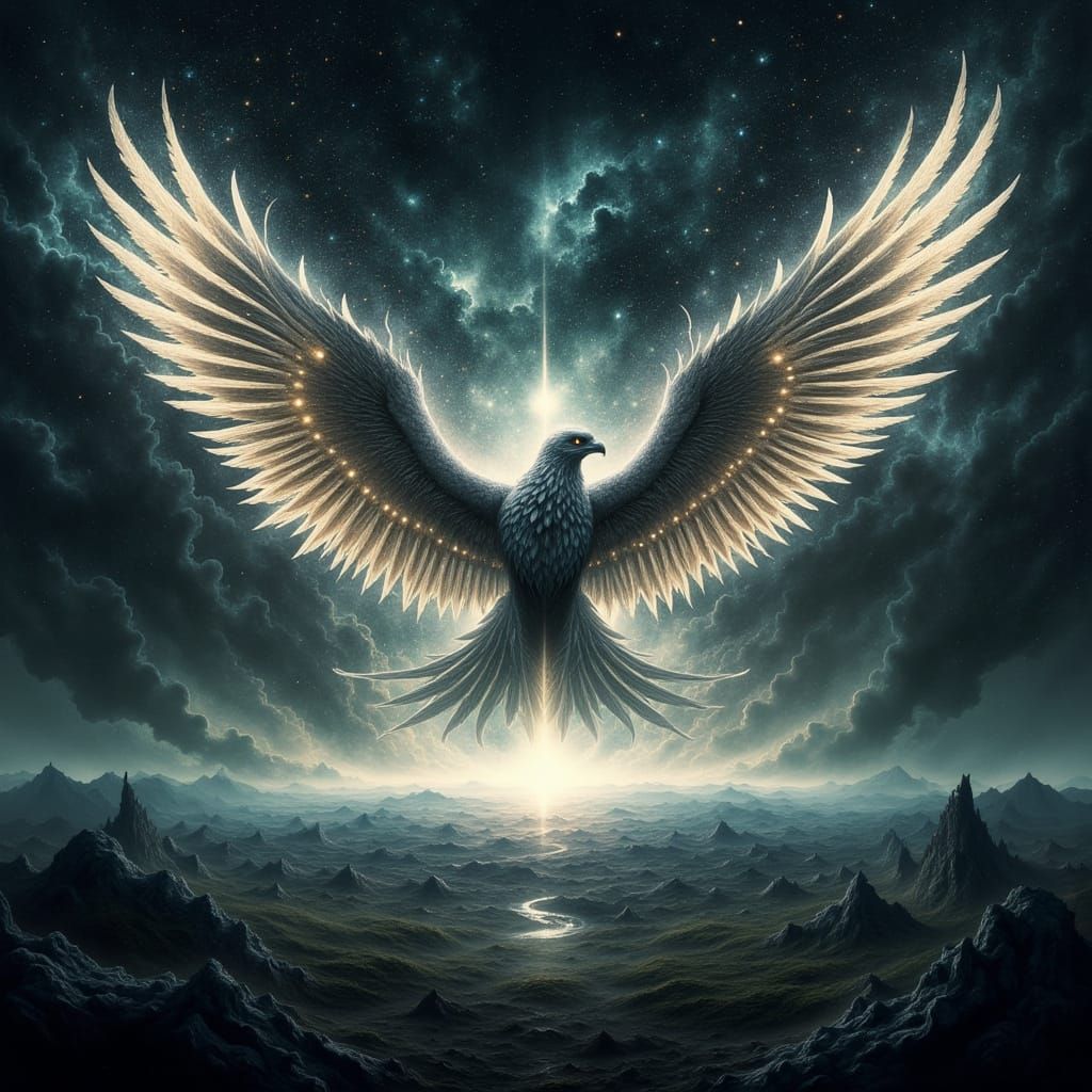 This image depicts a majestic griffin flying through a dramatic, star-filled sky with swirling nebulae. The creature's feathers shimmer, and its eyes glow, set against a backdrop of cosmic horror and epic fantasy concept art.
