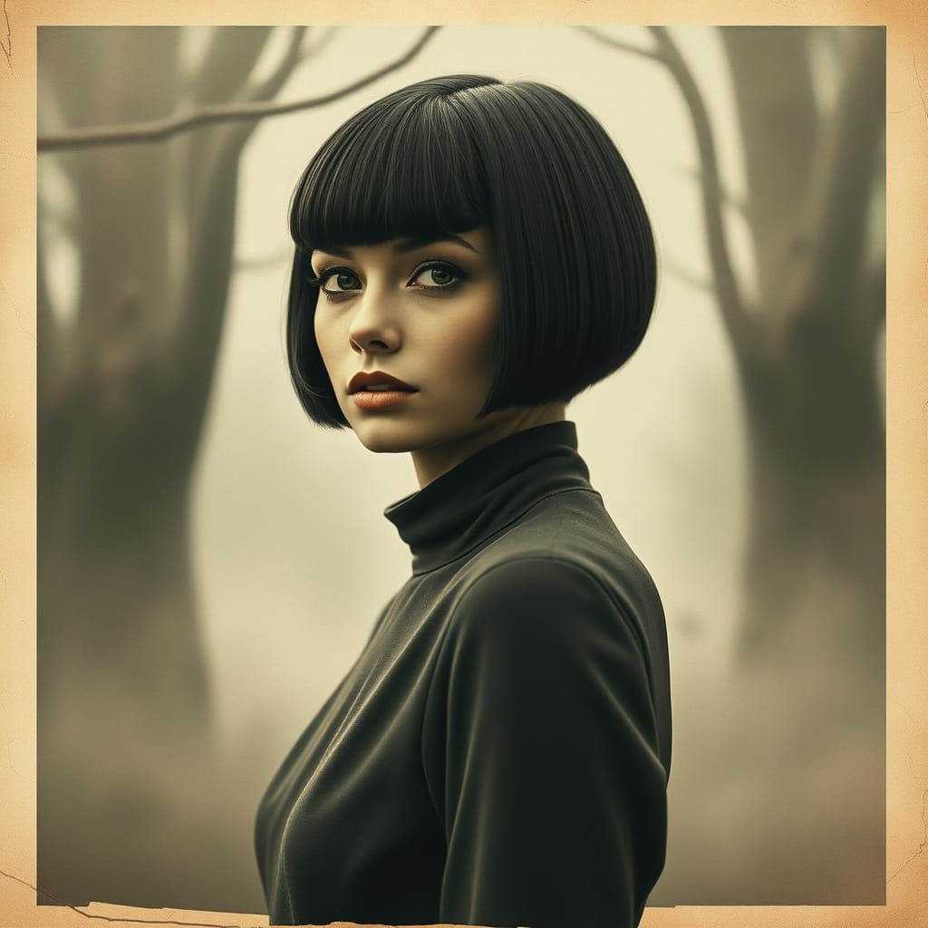 This image shows a vintage woman with a geometric bob and fringe, in a high-necked dress, posing in a mystical double exposure. The aesthetic is surreal, dreamlike and printed on textured paper, with muted earthy and pastel tones.