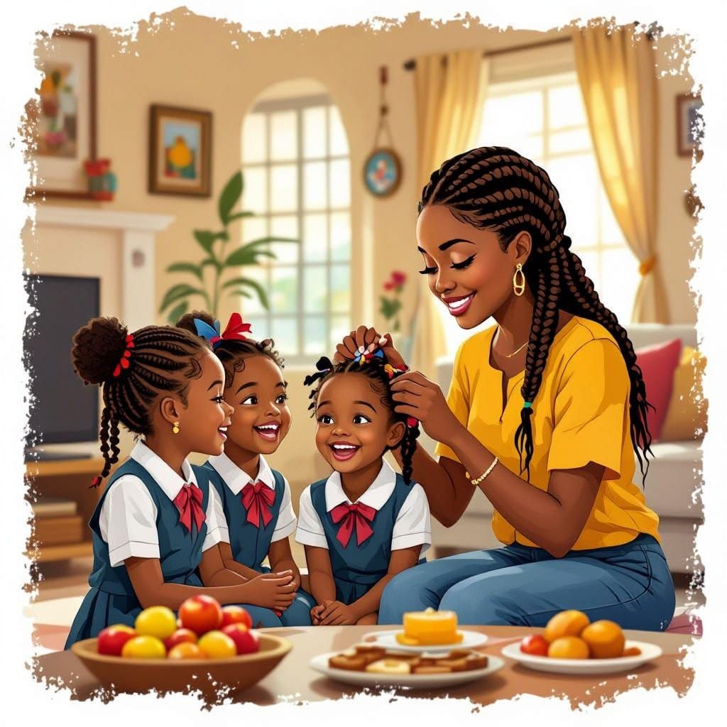 This image depicts a warm and intimate Nigerian family scene, set against a backdrop of earthy tones and eclectic decorations. A teenage girl gently braids her sister's hair, surrounded by her loved ones, in a moment of quiet joy and companionship.