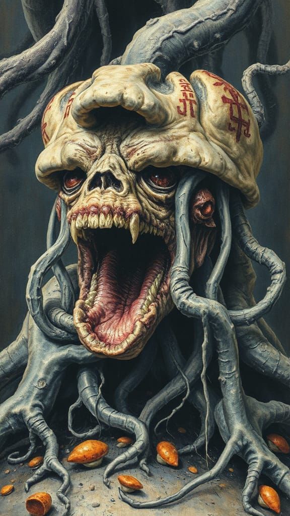 This image shows an eerie, ancient fungal entity ensnared by bizarre roots, its mouth open in mute insanity. The figure features alien symbols carved into fractal layers of skin, rendered in dark, surreal tones evocative of cosmic horror art.