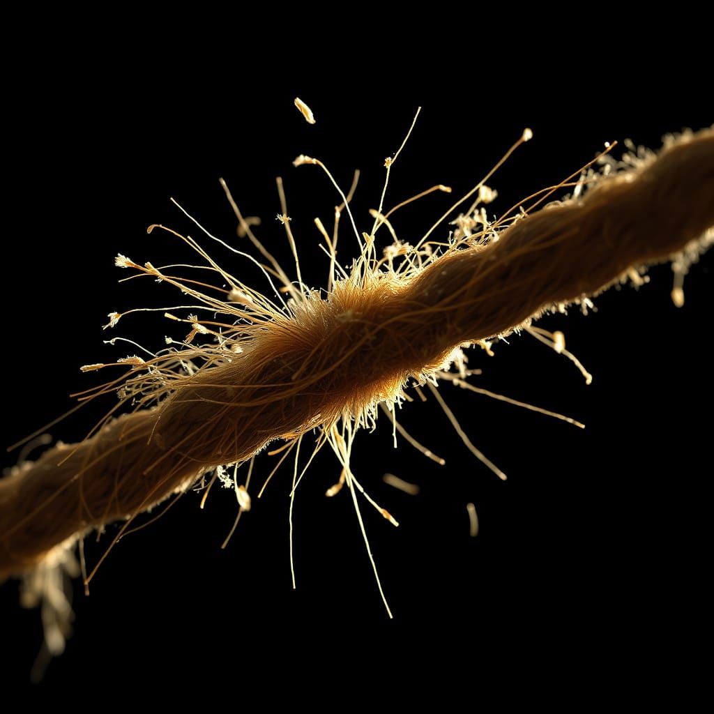 A dramatic close-up shows a thick rope breaking apart in mid-air. Fibers glow with strong backlighting. Expressive textures and hyperrealistic detail define this moody image.