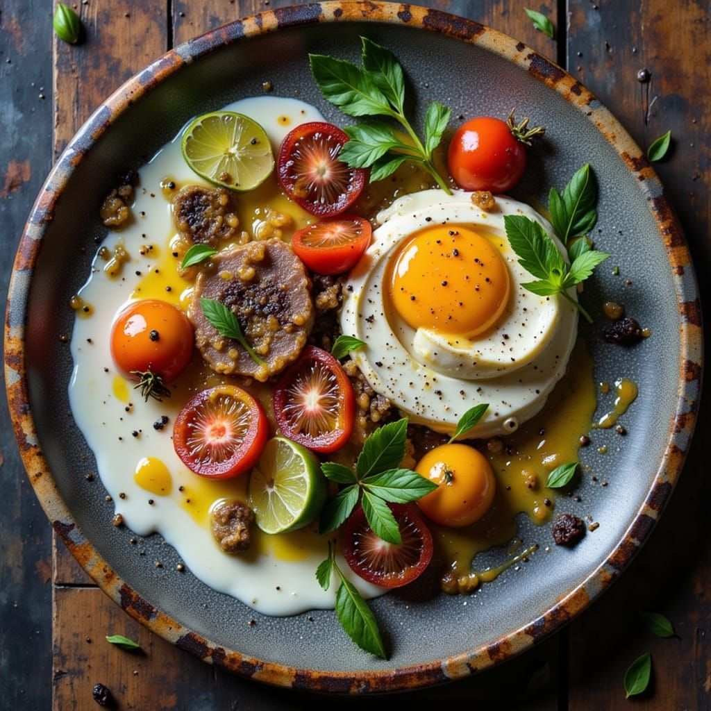 This image captures a culinary scene, transforming food ingredients into a visually appealing feast. It's a photograph that looks like an ink painting, showcasing edible beauty.