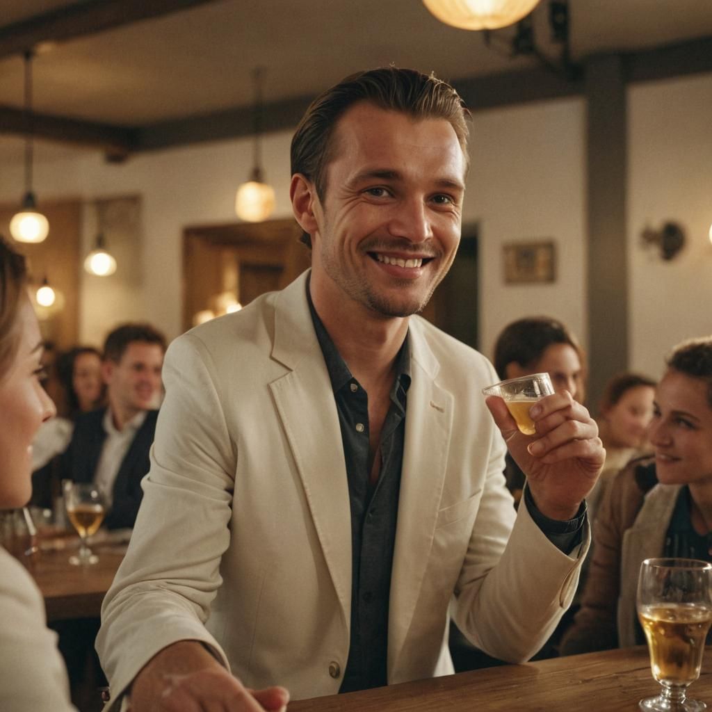 A close-up shot of a smiling Slavic man in a warmly lit restaurant with friends. The image features cinematic color grading, shallow depth of field, and subtle film grain.