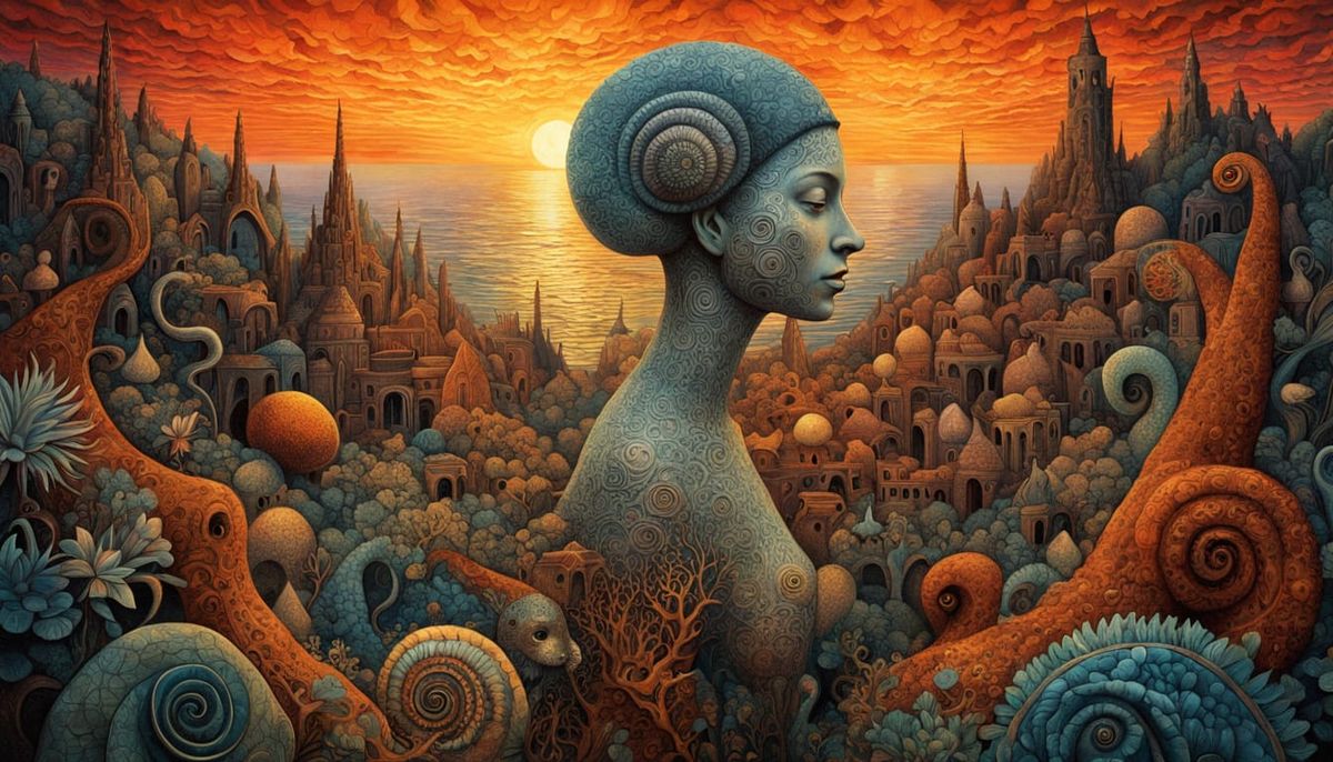 This enchanting image depicts a mystical shaman amidst a labyrinth of music, surrounded by a stunning sunset, carefully reconstructing the pieces of cracked mirrors. Glowing creatures from folklore and mythology blend with a multi-layered fantasy plant kingdom, creating a vibrant, bioluminescent world.