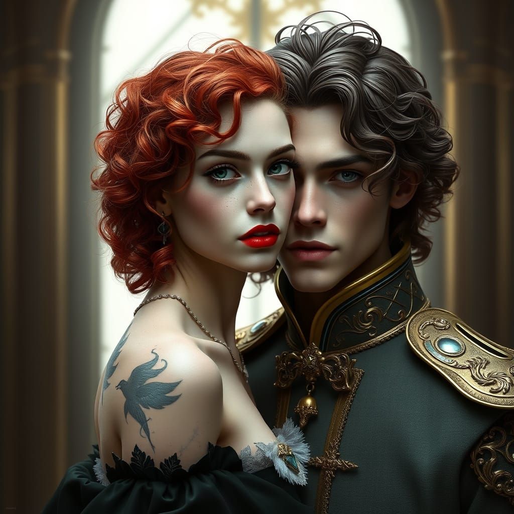 This image shows a striking portrait of a young, feminine vampire with red curly hair and freckles, standing with a tall, youthful prince. The artwork features dynamic lighting, intricate details, and organic curves.