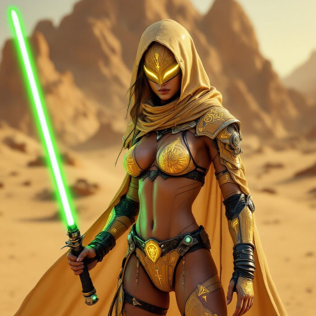 A female warrior stands menacingly in a desert world, wearing a mix of futuristic and dark armor, with a green lightsaber in hand, set against a detailed matte painting backdrop with cinematic lighting and shadows.