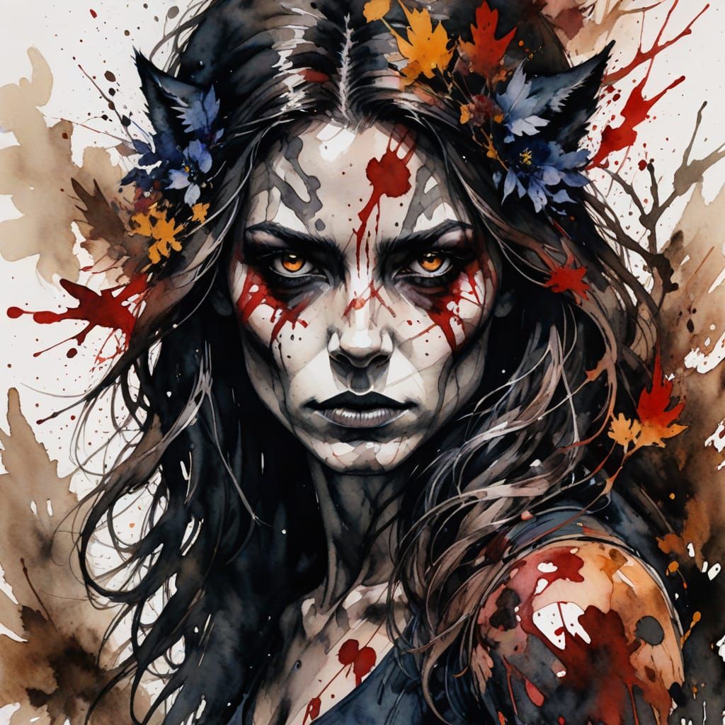 This image shows Wolfsbane of the X-Men in mid-transformation. Earthy browns and deep reds blend with wild foliage. Feral ink textures create a raw, abstract elegance in watercolor.
