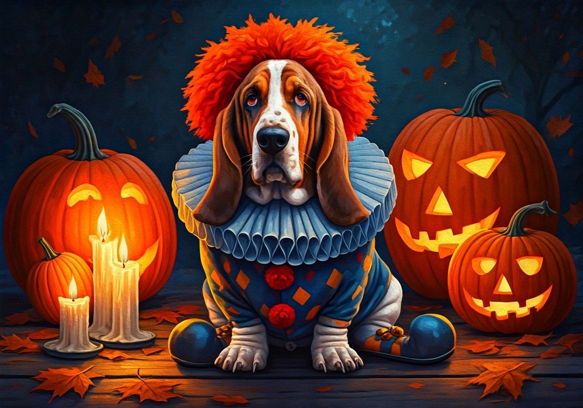 Easily generate your own vibrant oil paintings of basset hounds dressed as clowns for Halloween. Free and fun!