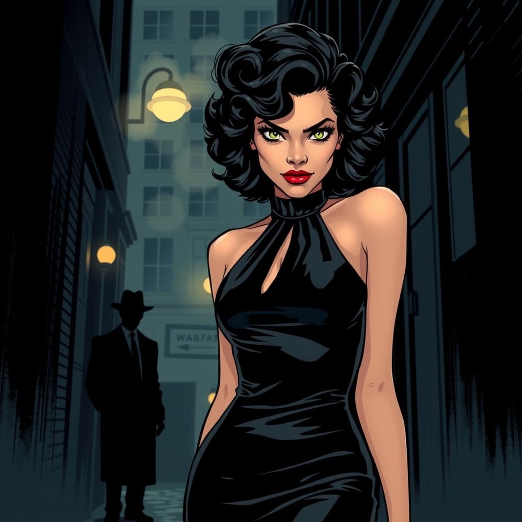 This image is a striking depiction of a sultry woman in a black evening gown, set against a smoky alleyway backdrop, with bold lines and graphic shapes reminiscent of classic film noir.