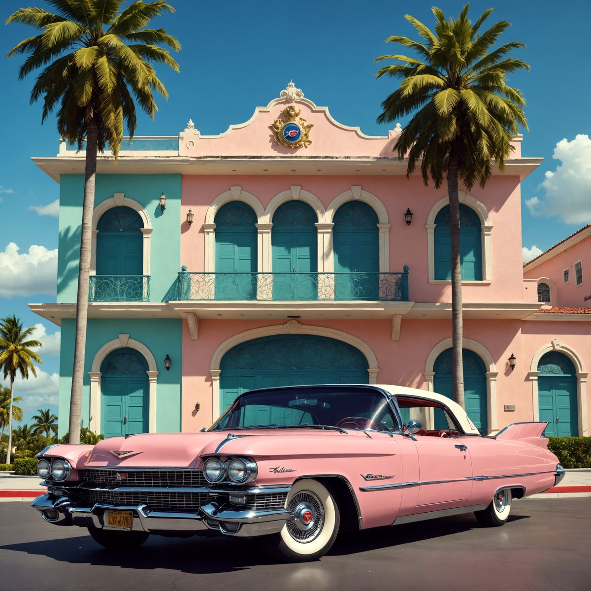 Transform your car designs with our free AI image generator. Easily create stunning retro car images like this 1959 Pink Cadillac Eldorado at a Miami hotel.