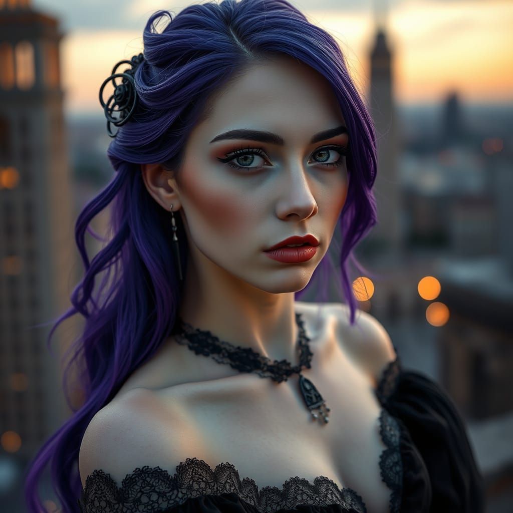 This image features a stunning, photorealistic portrait of a young woman with royal purple hair, adorned in intricate goth clothing, posing against a warm cityscape background at dusk. The atmosphere is moody and introspective, with a sense of quiet contemplation.