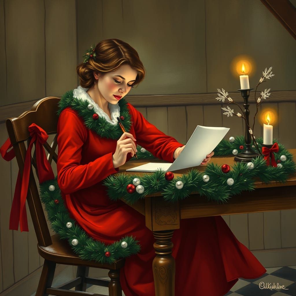 A festive scene depicts a woman in a red dress seated at a Christmas-decorated table. She holds a quill, gazing at a blank letter, illuminated by soft candlelight in a warm, painterly style.