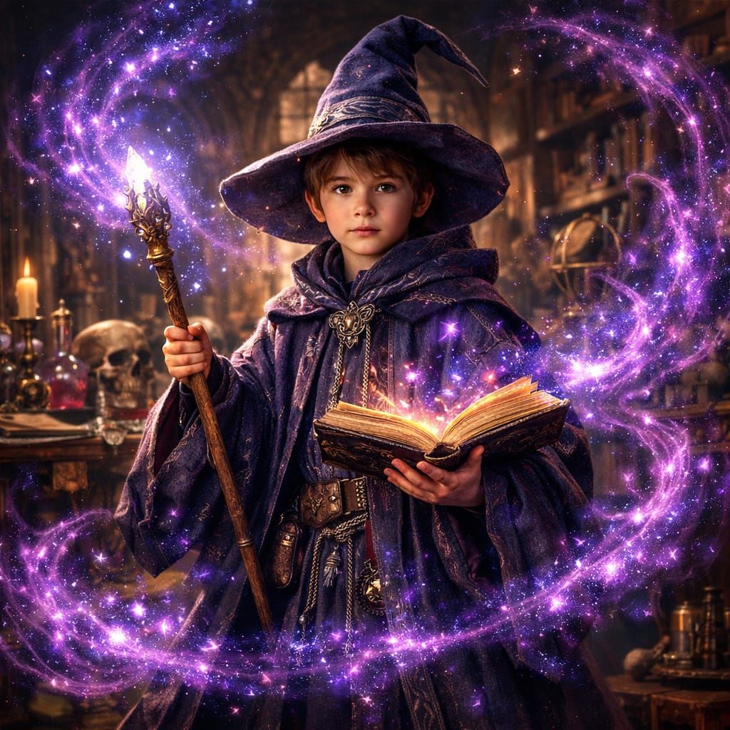 This image depicts a young wizard in oversized robes, surrounded by vibrant, swirling stardust in an ancient classroom. Rendered with extreme detail and volumetric lighting, it captures a fantasy realism aesthetic with sharp focus and high contrast.