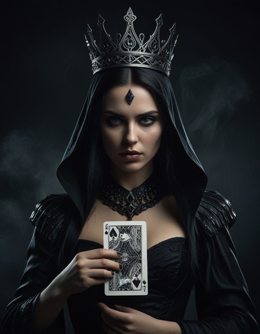 This image features a regal and threatening Dark Queen of Spades, surrounded by mystical tarot cards. Cinematic lighting and gothic elegance create a dramatic, fateful atmosphere.
