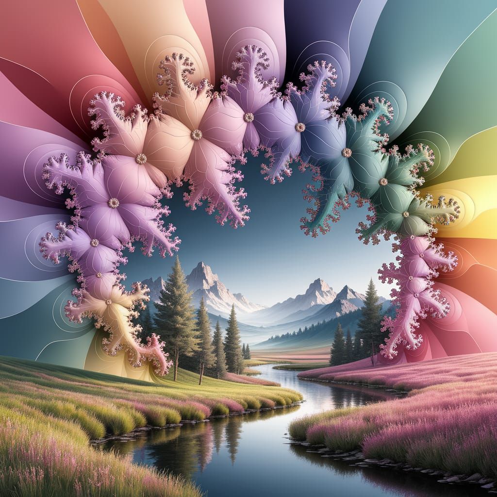 This stunning oil painting showcases an intricate fractal lace pattern in soft pastel colors, set against a serene landscape with a clear blue sky, a gentle stream, and distant mountains, all surrounded by lush trees and delicate gold accents.