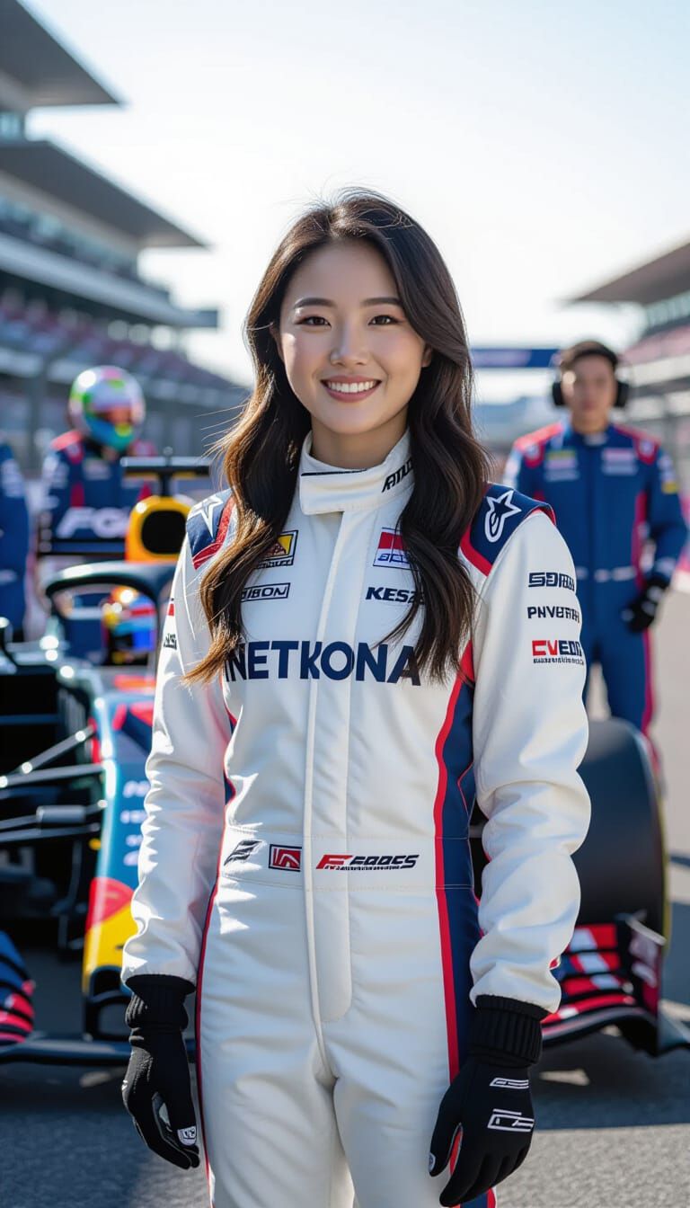 This photorealistic image captures a smiling Korean woman in a racing suit, posing confidently beside a Formula One car. It evokes the prestige and speed of professional motorsports, set with cinematic lighting.