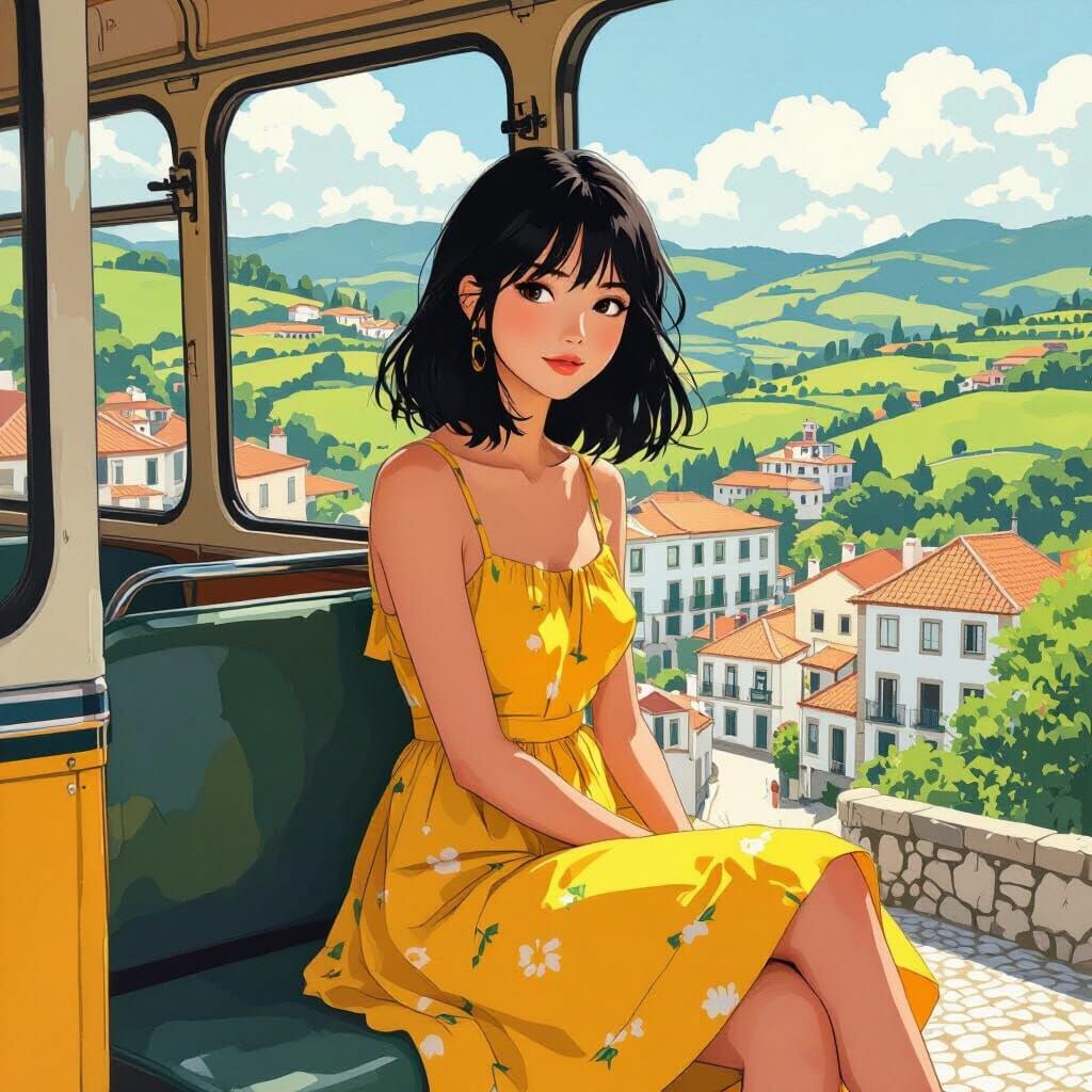 This image shows an Asian girl with black hair on a vintage bus in Portugal. She is wearing a yellow sundress and is surrounded by lush green hills and traditional Portuguese architecture, in an impressionist style.