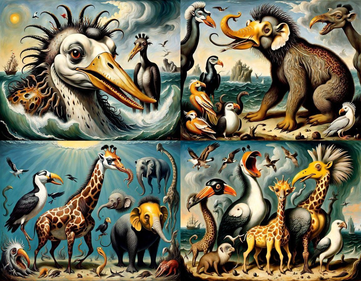 This haunting image depicts a grotesque fusion of African and oceanic creatures amidst a lush, dreamlike landscape. Inspired by the Romantic styles of Turner, Dali, and Tapies, this surreal work showcases a nightmarish world of beauty and terror.