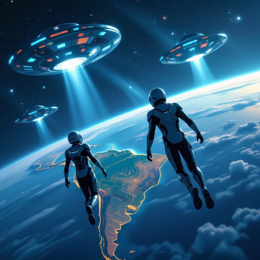 This image shows metallic suited aliens flying in space. Luminescent flying saucers hover above a detailed map of Brazil. The artwork has a cinematic, digital matte painting aesthetic.