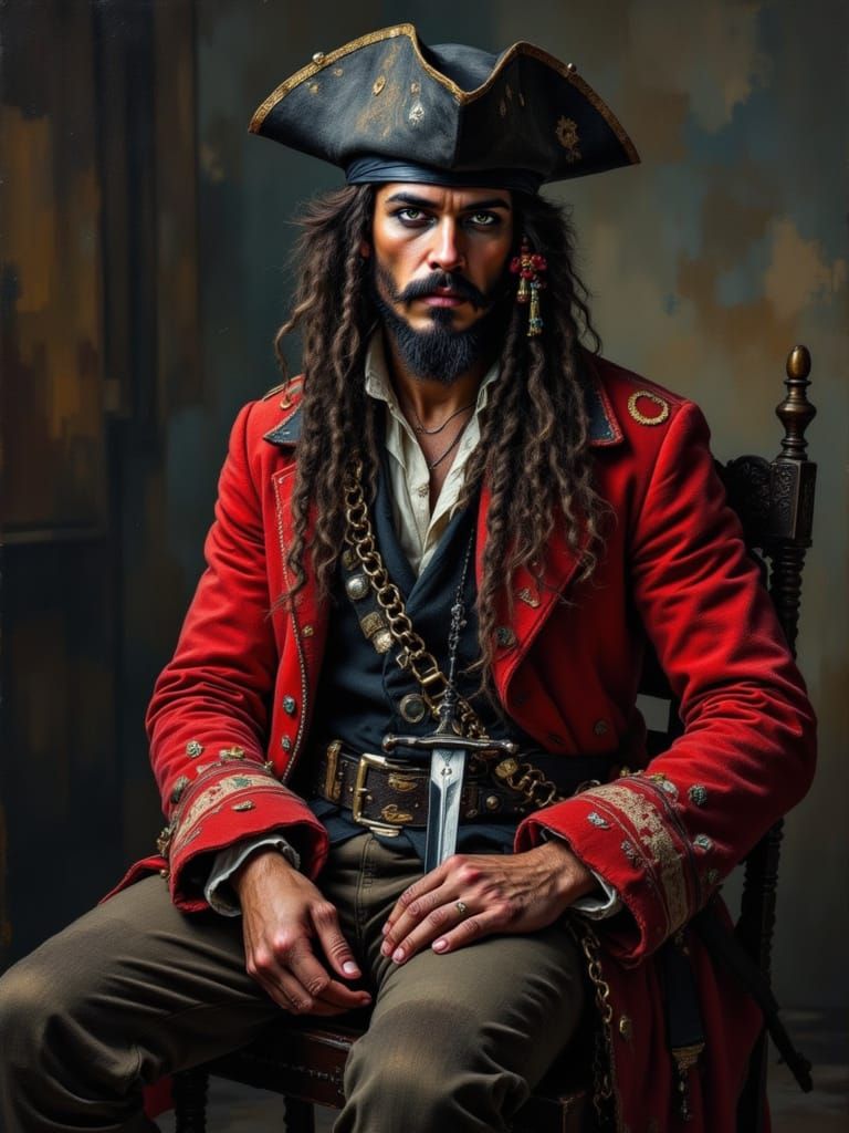 This image depicts a studio portrait of the pirate Blackbeard, seated with his cutlass. The style is reminiscent of classical portraiture with an encrusted, detailed aesthetic.