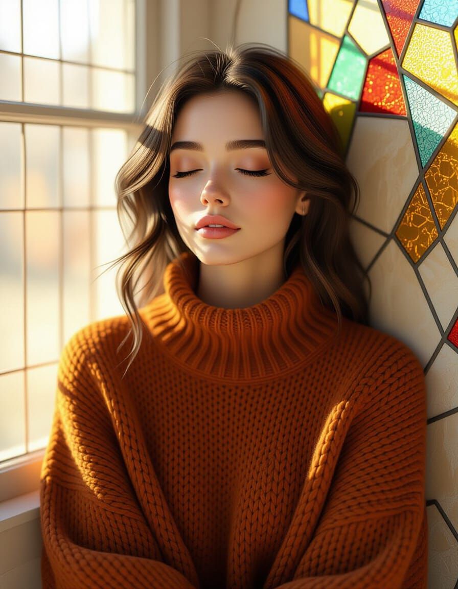 Experience the elegance of a hyper realistic 3D digital portrait, where beauty meets artistry in a stained-glass effect. This close-up artwork captures a serene woman with mosaic-inspired patterns across her face, hair, and attire. The warm earthy tones, detailed knitted sweater, and glowing window background bring a surreal yet lifelike quality. Perfect for lovers of modern art, digital mosaics, and intricate fantasy designs.