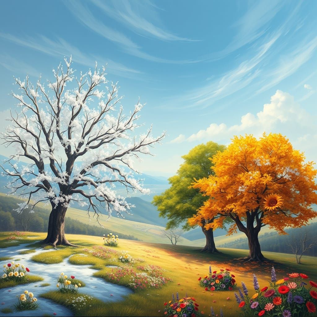 This digital matte painting showcases four distinct seasons, each with unique flora and trees, under a soft gradient sky. Inspired by ethereal landscapes and vibrant floral art.