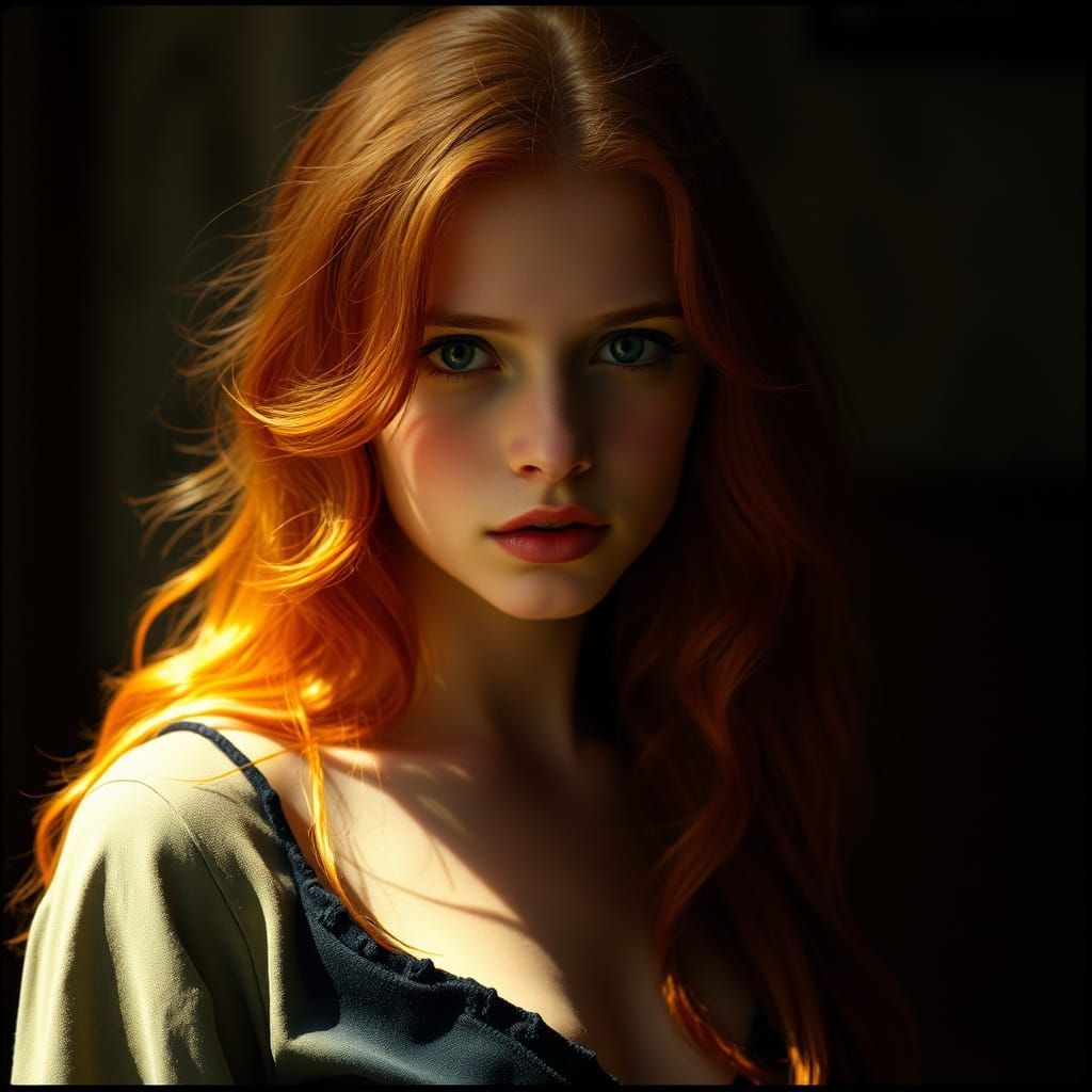 This image shows a beautiful 19-year-old woman with red hair in a cinematic style. The portrait features film grain, vignette, and dramatic, atmospheric lighting.