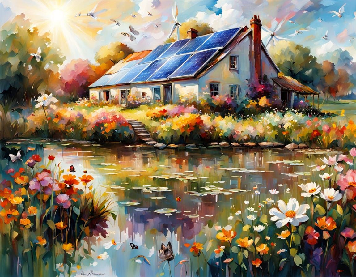 This image depicts a charming solarpunk-inspired white house with solar panels, a wind turbine, and lush surroundings. A curious cat explores the meadow, pond, and vibrant flowers. The artwork combines intricate details with a cinematic feel, reflecting the artistic styles of the masters who inspired it.