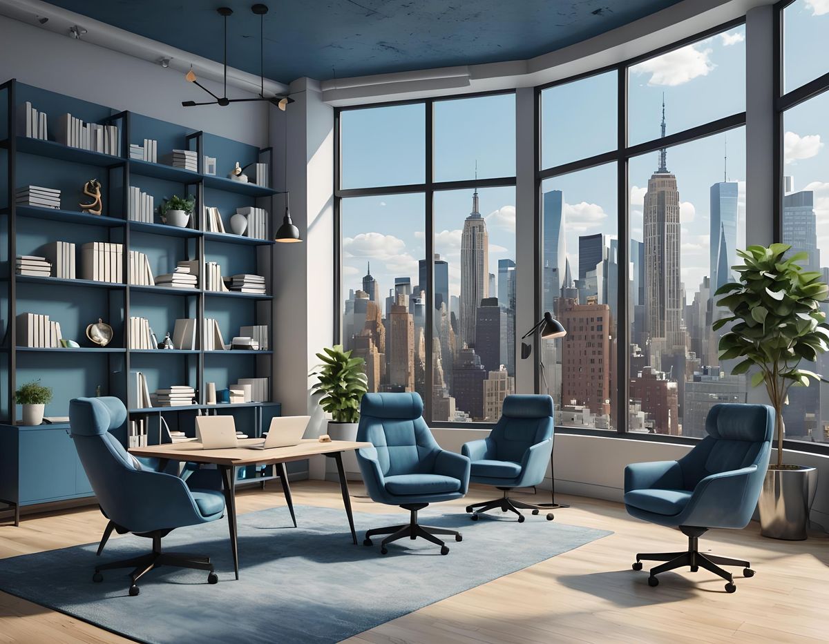 A 3D rendering of a modern blue office featuring armchairs, a laptop on a desk, and a shelf partition with decorations. A panoramic window overlooks New York.