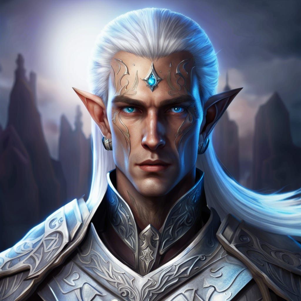 A detailed digital painting of a high elf paladin with silver hair, blue eyes, and a rune tattoo. The image features deep colors and intricate details, with complementary colors.